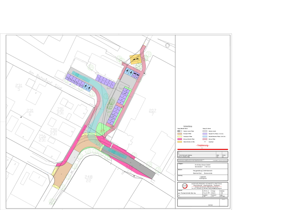 2) Der geplante Fußgänger- und Fahrradweg sollte anders als in der Planung vorgesehen nach Westen direkt an das Gebäude Bahnhof-Süd gelegt werden, da ein großer Teil der Schüler und Schülerinnen den geschotterten Weg nach Westen zum Schulzentrum nimmt und aus Sicherheitsgründen auch nehmen sollte. Für diese Schüler ist damit keine unregulierte Querung der geplanten neuen Parkplätze notwendig.