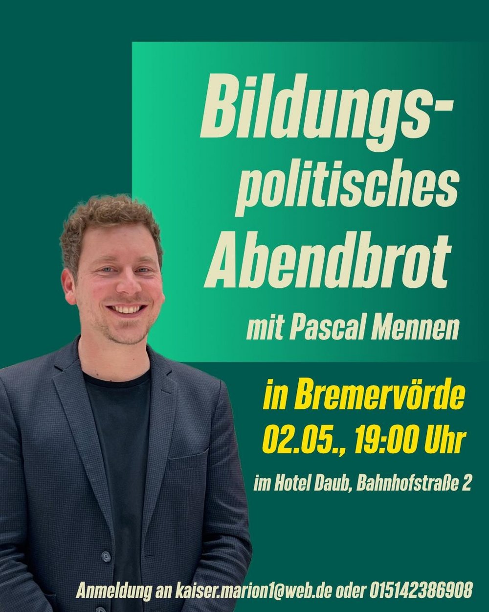 Pascal Mennen, schulpolitischer Sprecher von BÜNDNIS 90/DIE GRÜNEN kommt am 02. Mai nach Bremervörde