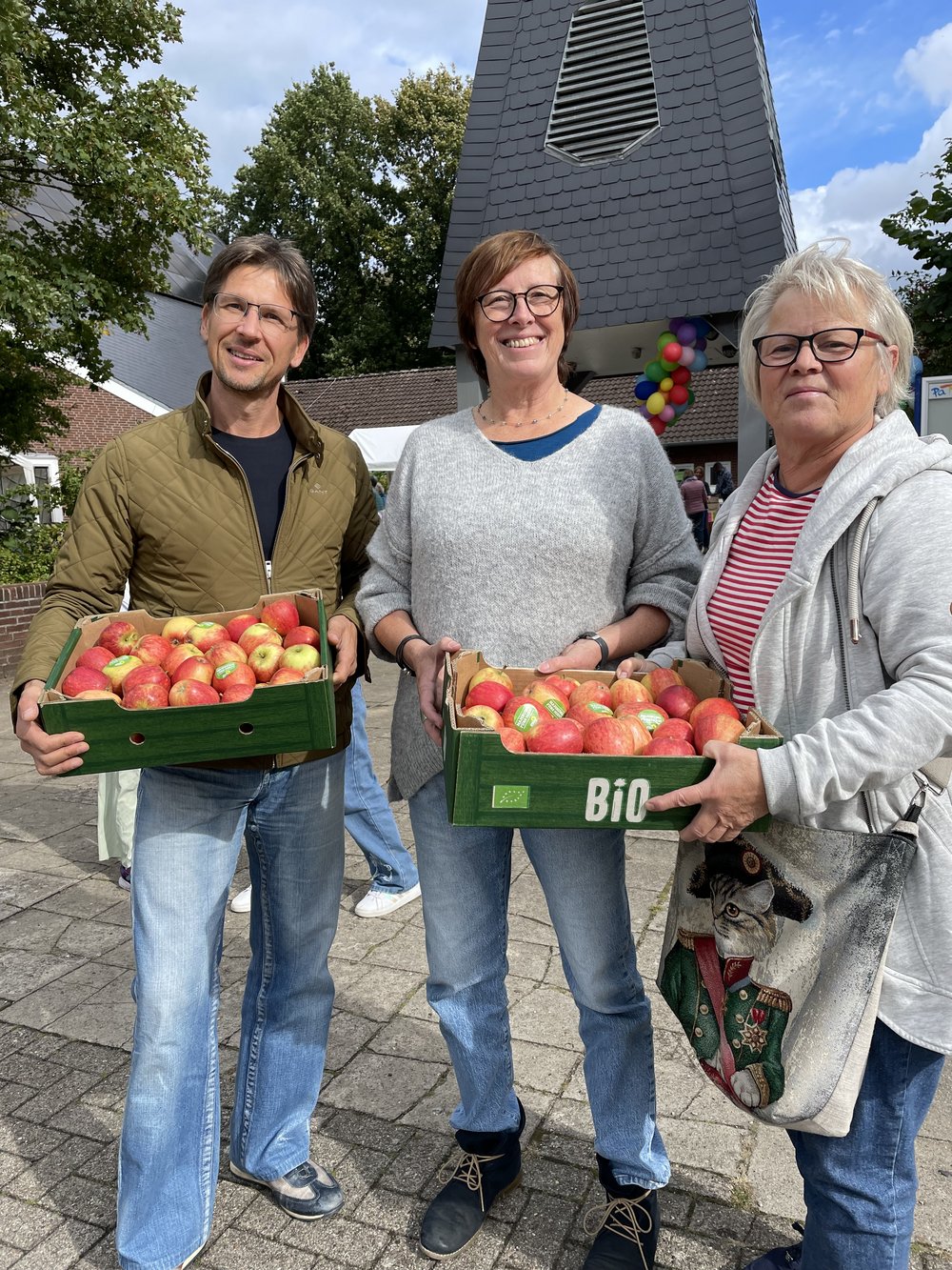 Zum 10 jährigen Geburtstag überreichen die Grünen zwei Kisten mit Äpfeln in Bioqualität an die Leiterin des Stadtteilladens Almut Schmidt. Im Stadtteilladen werden Kinder nach der Schule betreut. Hier wird gebastelt, gespielt und Grundschulkinder bei den Hausaufgaben unterstützt. Gleichzeitig ist es eine Beratungsstelle für Alltags- und Erziehungsfragen. „Wir gratulieren ganz herzlich zum zehnjährigen Geburtstag“, so Marion Kaiser und Christian Beil von den Grünen. „Ihr leistet hier tolle Arbeit.“